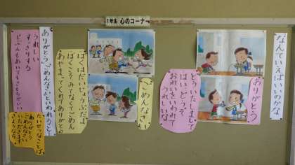 上の写真は、1年生の「こころのコーナー」です。内容項目「礼儀」の教材「なんていえばいいのかな」(主題 たいせつなことば)の授業で、吹き出しの中身を考え、話合いで出てきた言葉を掲示しました。この時期の1年生は、まだ自分の考えを文章化して書くということができない子が多いので、板書された言葉を読み合うことで、自分の考えを確かめたり、語彙を増やしたりすることができると考えます。高学年では、主発問に対する考えや、学びの振り返りを書いたワークシートを掲示しています。他クラスの友達の考えを知るよい機会になっています。