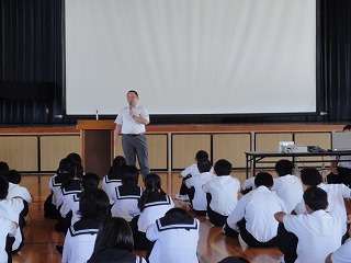 西尾警察署の生活安全課の職員の方をお招きして、ケータイに関わる犯罪やトラブルやその対策などについてのお話を聞きました。その後、出会い系サイトにはまってしまった少女の例や不審なメールからの振り込め詐欺にはまってしまった男性の例を取り上げた映像を見ました。