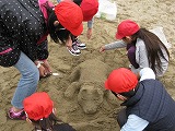 11月8日(木)には、「なかよしふれあいデー」として、校区西端にある木曽川祖父江緑地に全校で歩いて出かけました。公園内では、許可を取って「サンドアート」を縦割り学級の班(4〜5名)ごとに作りました。「サンドアート」は、砂でできた砂像のことで、毎年10月上旬に行われる「稲沢サンドフェスタ」でも、地元から多数出品されます。その参加者でもある方が、ボランティアで作り方のこつを教えにきてくださいました。また、公園の管理者の方も手伝ってくださり、子どもたちは、イルカや子犬、いなっピー(稲沢市のゆるキャラ)など思い思いの作品を、40分程度で協力して作り上げていました。