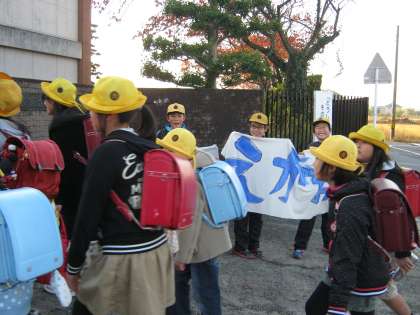 本校では、毎月第3月曜日で始まる週をあいさつ週間と位置づけ、児童会が中心となり、校門で横断幕を持ってあいさつを呼びかけています。また、このあいさつ週間は、本校だけではなく、葉栗中学校、葉栗小学校でも合わせて行い、連区全体で取り組んでいます。今年度当初のコミュニティ・学校運営協議会での決定を受けて、地域ぐるみで活動し始めました。