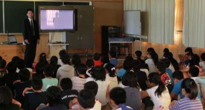 蟹江町立学戸小学校では、2012年10月2日、毎年恒例の武藤玄先生を講師にお迎えして、6年生全員82名を対象にサイバーネット教室を開催しました。