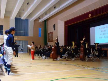 当日は、吹奏楽部の伴奏のもと、各部活動やスポーツクラブの会員の方々とともに、被災地へ向けて合唱をしました。