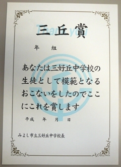 本校には「三好丘中学校」という学校名をから三丘賞(さんきゅうしょう:Thank you賞)という賞があります。これは特別なことをしてもらえる賞ではなく、日常のがんばりが認められてもらえる賞です。申請は、友だちや先生が行います。三丘賞申請用紙に対象者の名前とその理由を書きます。校長、教頭、教務主任、生徒指導主事に認められると三丘賞を受賞できます。