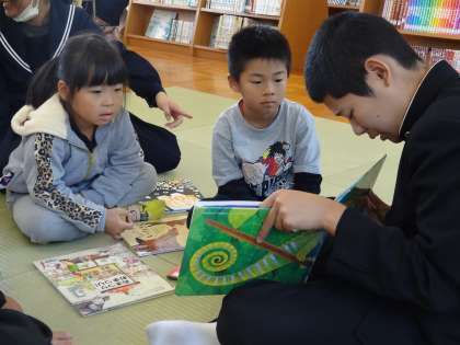 11月14日は、中学生が低学年に本の読み聞かせを行う「小中読み聞かせ」が行われました。中学生が選んだ本を、思い思いの場所で小学生に読み聞かせをします。毎年、低学年は楽しみにしている行事です。優しい笑顔で小学生に読み聞かせをしている中学生の姿は、なんとも言えないほのぼのした気持ちになります。低学年の「○○ねえちゃん、また読んでね」「ありがとう、○○にいちゃん」という声が、あちこちから聞こえ、中学生の優しい笑顔がとても印象的でした。