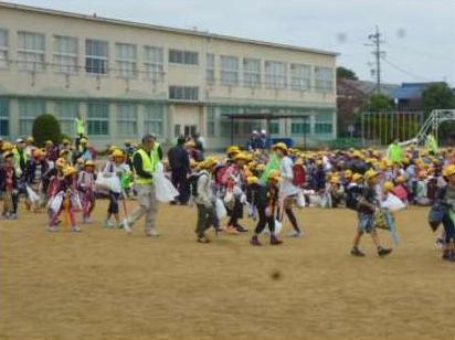 10月31日(金)に、葉栗連区のごみゼロ運動と連携して、地域の方やPTAのお母さん方と一緒にごみゼロ運動に参加しました。運動場で、連区長さんのお話をうかがった後、通学班ごとに分かれてそれぞれの清掃場所へ出発しました。清掃場所は、通学班の集合場所や通学路です。いつも利用している集合場所や通学路ですが、ごみを拾うという視点をもって見ると、いろいろなところにごみが落ちていることに気づきます。木の根元や草の陰に落ちている紙くずや空き缶、吸い殻などを一生懸命に拾いました。個人では、スーパーの袋に燃えるごみを集め、班長は燃えないごみを集めました。