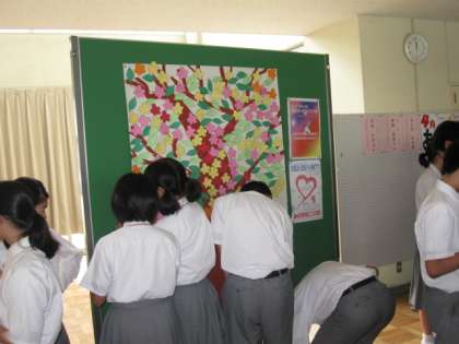 本校の廊下は、生徒からのこのようなありがとうメッセージであふれています。些細なことから大きなことまで、生徒が日常生活で感じた「ありがとう」の瞬間を、花やしずく、雲形に切られた紙に書き、生徒会役員が貼っていきます。そして、「ありがとうの木」「ありがとうのジュース」「ありがとうの空」と題して、各学年のフロアに期間限定で飾られていきます。
