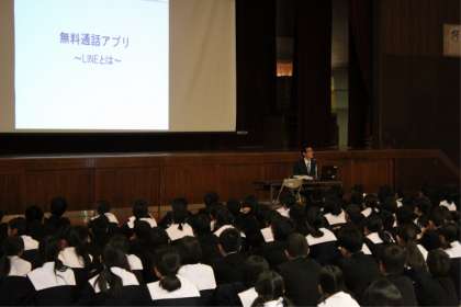 本校では、「自尊感情を高め、人権感覚を育成する教育の充実」をめざしています。教科や道徳の学習、学校行事、部活動等を通して、自分の大切さとともに他者の大切さを認め、思いやりをもった生徒の育成を目指しています。その成果があって、様々な活動で協力し合い、意欲的に取り組む生徒の姿が多く見られます。しかし、課題が全くないわけではありません。携帯電話での友達間のトラブルが起こることがあります。そこで、人権感覚を損なうようないじめや犯罪被害につながる携帯電話の使い方について学習する機会を設けました。12月3日に愛知警察署生活安全課の方を招き、生徒たちに講話をしていただきました。ネットモラルで一番大切なことは、相手を思いやることが大切であることを話していただきました。無料通話アプリを使って、友達の悪口をやりとりしたり、友達を仲間はずれにしたりすることがいじめにつながることを実際に起きた事例を挙げて話していただきました。また、ネット上に自分の個人情報を流したり、見知らぬ人とネットでやりとりしたりすると、犯罪に巻き込まれる危険性があることについても話していただきました。講話後の生徒の感想に次のようなものがありました。