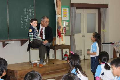 本校では、11月28日に人権教室を行い、宇野政博さん(元豊田市人権擁護委員)をお招きして、腹話術を交えた講話を聞きました。