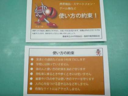 豊橋市では,今年度,豊橋市小中学校PTA連絡協議会,小中学校長会,教育委員会が共同で「携帯電話・スマートフォン・通信機能をもつゲーム機等の利用ガイドライン」を策定し,使い方の約束を啓発するカードを小学校4年生以上の児童生徒に配付しました。