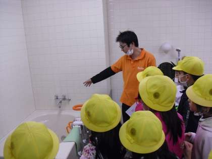 「施設の工夫を教えてもらおう」では、お風呂やトイレなど家庭にもある施設について、利用するお年よりにとっては快適に過ごせる、介護する施設の方にとっては負担の少なくなる工夫について詳しく教えていただきました。