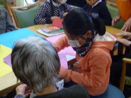 「お年寄りと交流しよう」では、帽子を一緒に作ったり、作ってあげたりしました。一生懸命作る子どもたちの姿に、目に涙を浮かべて喜んでくれる方もいらっしゃいました。最後に、音楽の授業で習った「ふじ山」をうたうと、大変喜んでいただき一緒に口ずさんでくれる方もいらっしゃいました。お年寄りからの盛大な拍手に、子どもたちは、達成感を感じている様子でした。