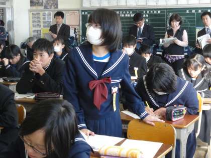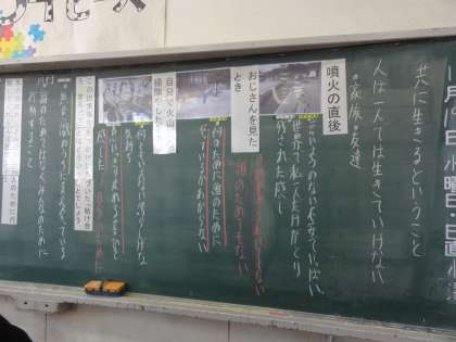 実践では、いまから4年前に起こった新燃岳の噴火によって、実際の中学生の女子生徒が体験したエピソードを題材としました。はじめは「人は一人では生きていけない」という言葉に強い反発を感じていた女子生徒が、“道路に降り積もった火山灰を誰のためでもなく黙々と掃除する人の姿”を見たり、“自分自身が火山灰の除去作業をすること”を体験したりすることで達成感や満足感を感じ、人は多くの人の善意によって支えられて生きていることに気づきます。そして、「助け合うこと・支え合うこと」の本当の意味を理解することができたというものです。以下に生徒が書いた感想の一部を示します。