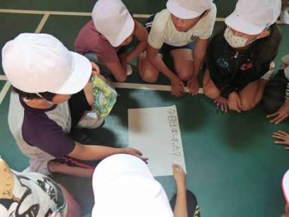 4月から、学年ごとに、先生同士で打ち合わせを重ね、お互いにゲームを持ち寄っています。例えば4年生では、岩津小75人に対し、聾学校の子は6人と少ないですが、できるだけ多くの子が触れ合えるように工夫しています。初めに、「関所じゃんけん」で、聾学校の子と一人ずつ、手話で自己紹介をしてじゃんけんをしました。手話も、毎年やっているので、4年生では、覚えてしまっている子もいます。そのあと、聾学校の子を入れたチームに分かれ、3つのゲームを行いました。2本の棒で段ボールを運ぶ「お宝運びリレー」と、列になってボールを次々に送っていく「ボール運びリレー」、「ジェスチャー伝言ゲーム」、で、聾学校の子がどこにいるかわからないくらい、みんなゲームを楽しんでいました。