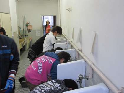東海市横須賀小学校では,児童会の呼びかけにより,5・6年生の希望者で校舎内のトイレを徹底的にきれいにする活動をしています。一人一つの便器を担当し,担当した便器を隅々まできれいにすることで,今後もトイレを使用するときに汚さない努力をしよう,スリッパの整頓をしっかりしようと心がける児童を育成するねらいがあります。