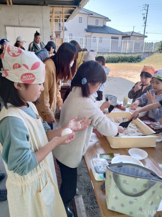 素手に塩をつけて、おにぎりを握ることも初体験で、手にいっぱいご飯粒をつけながらも、自分で作るおにぎりは格別だったようです。