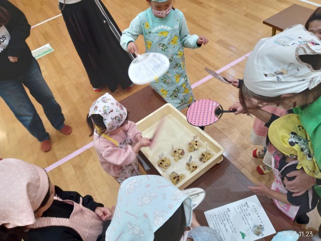 この地方の郷土菓子「鬼まんじゅう」の形が味岡児童館のキャラクター、ぱるもあザウルスに似ていることから、毎年の恒例行事として開催しています。