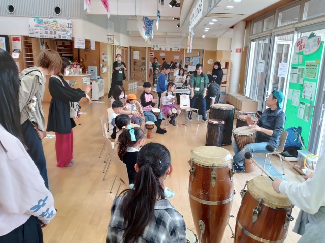 その中、アフリカの太鼓を使った音楽遊びを行い、太鼓を叩きながら館内を練り歩き、賑わいを生み