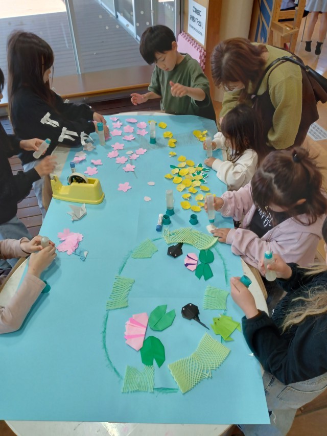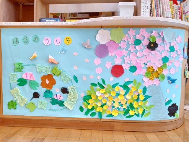 1人ひとりが作ったものを合わせて貼り合わせていくと、春の華やかな景色になりました。