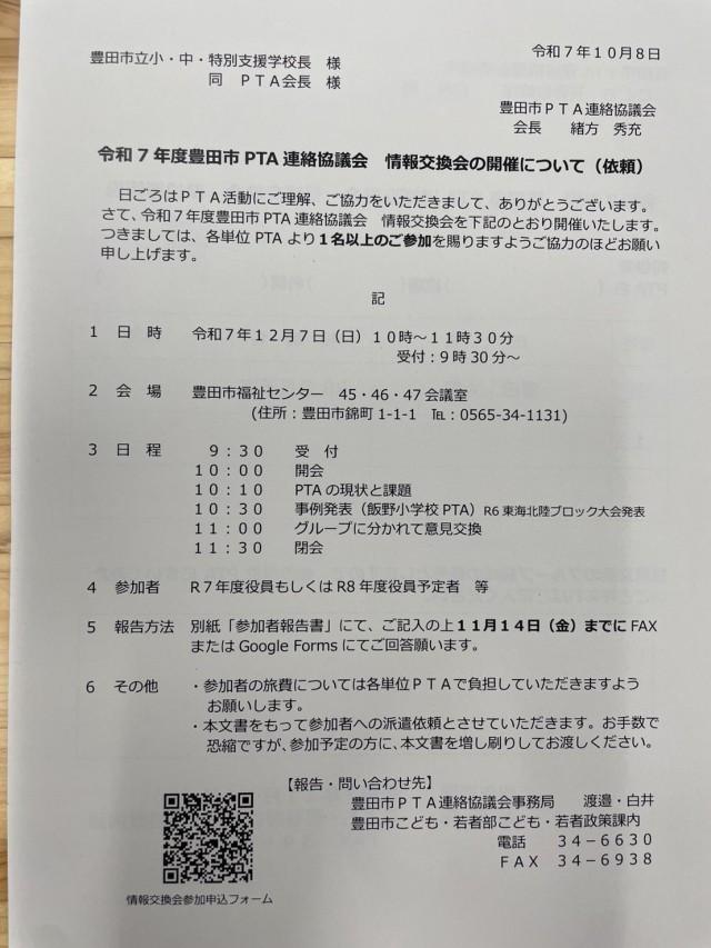 令和元年度以来6年ぶりの豊田市PTA連絡協議会主催の対面での情報交換会を以下のとおり開催します。