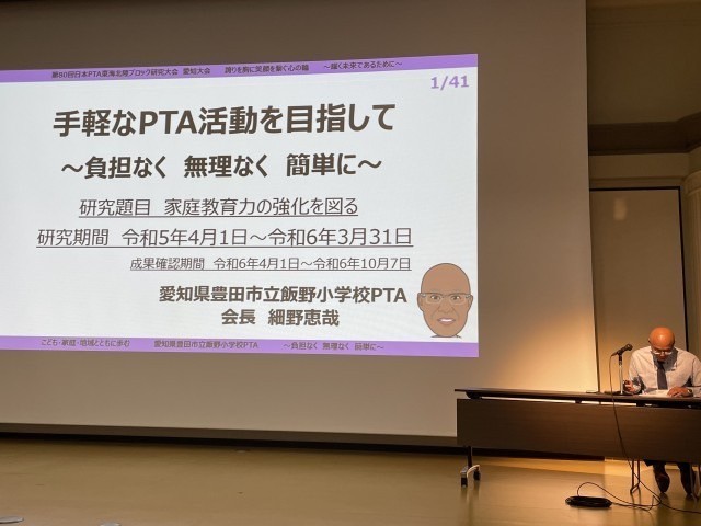 ②昨年度日本PTA東海北陸研究大会で発表した飯野小PTAの「手軽なPTA活動を目指して〜負担なく無理なく簡単に〜」の発表