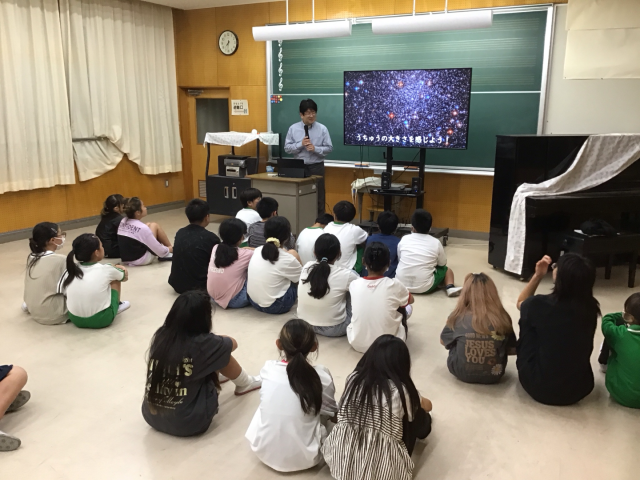 最後に、三重大学教育学部理科教育コース天文学研究室の伊藤信成先生と学生の皆さん、そして米ノ庄小学校の前田昌志先生をお迎えし、星空出前授業を受けました。ゲストティーチャーの皆さんのお話に子どもたちは興味津々で、星や宇宙について学ぶ時間は心に残るひとときとなりました。