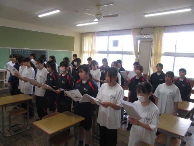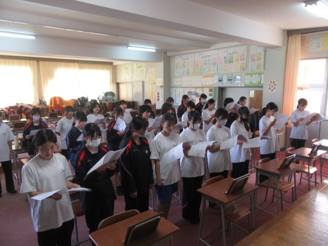 次に、全校合唱です。「あなたへー旅立ちに寄せるメッセージ」という名曲を歌います。写真はパート別に練習している風景です。