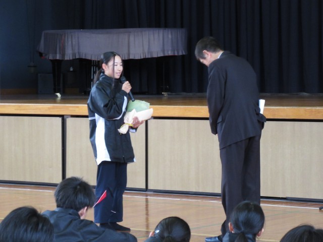 この日、2月で任期満了に伴い退任を迎える久保行央町長が勢和中を訪れ、子どもたちに挨拶をしました。これからも生まれ育ったこの多気町を大切に、大きく成長していってほしいという久保町長の思いを話された後、生徒会長から16年間の町政へのねぎらいと感謝の言葉を伝え、花束を贈呈しました。最後は全校生徒で花道を作って拍手でお見送りし、会場が温かい雰囲気に包まれました。