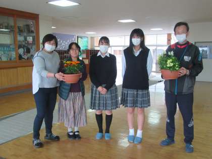 本校から相可高校生産経済科に進学した先輩2人が来校し、花の鉢植えを届けてくれました。