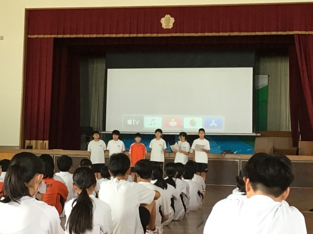今日の学年集会では、級長会の6人が9月30日のオレンジデー(社会見学)のことについて発表してくれました。