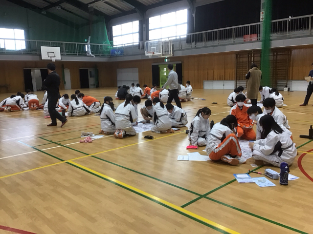 2年生では、2月12日5、6時間目に、市の防災対策課の方4名にきていただき、防災学習を行いました。