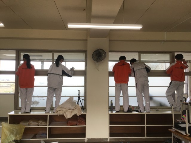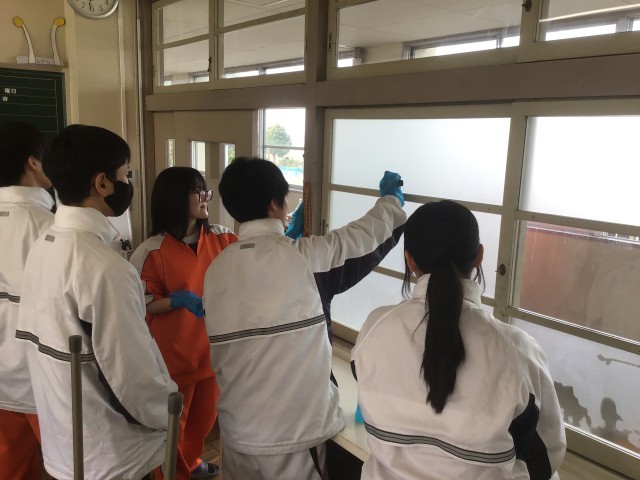 3年生は今までお世話になった教室や廊下、体育館を清掃しました。感謝の気持ちを込めながら、また、来年度の人たちが気持ち良く使ってもらえるよう、心を込めて掃除をしています。
