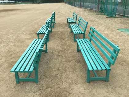 野球部のベンチの老朽化がひどく、座面等がさびたり、たくさんの穴が開いたりしていました。そこで、2人の校務員さんに修繕をお願いしました。座面を取り外したり、鉄を機械で切って溶接で取り付けたり、角を磨いたりした後、ペンキで塗装をしてもらいました。11脚もあるベンチを、プロ顔負けの技と速さで仕上げてもらいました。見違えるほどきれいになりました。