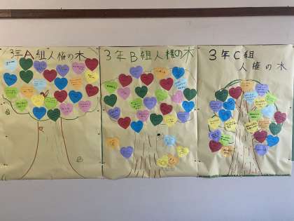 校区人権フォーラム 人権の木 公開日 2022/12/08 更新日 2022/12/08 人権 昨日の校区人権フォーラムの分散会で、各クラスでハート型の紙に安心宣言を記入し、人権の木を作りました。 いいね(0)