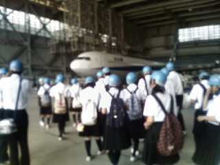 飛行機格納庫に降りてきました。とても広いです。 みんな、感動しています。