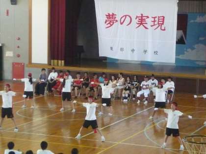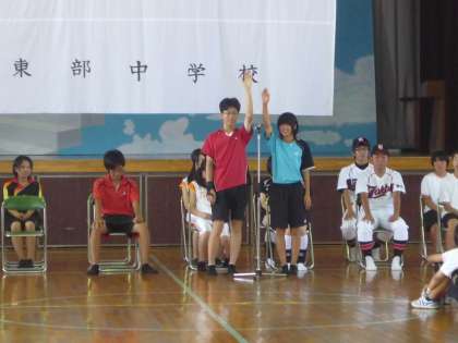 7月10日(火)に、松阪地区中学校総合体育大会に向けての壮行会を生徒会が開きました。吹奏楽部の演奏で各部の代表が入場し、生徒会長、校長先生から激励の言葉をうけました。続いて各部の正副キャプテンが試合に向けての抱負や意気込みを述べ、選手宣誓を行いました。そして体育委員を中心とした応援団による応援が行われ、選手たちを激励しました。松阪地区中学校総合体育大会の日程および会場は下記の通りです。応援をよろしくお願いします。