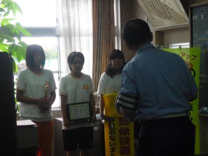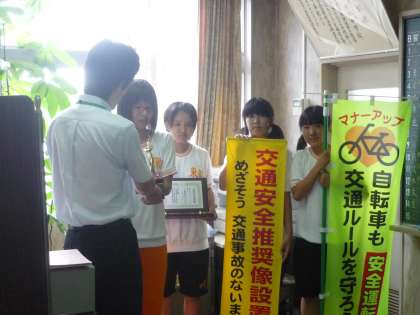 9月3日、交通安全推奨像の伝達式があり、生徒会役員4名が代表して出席しました。この活動は交通安全活動を広めるため2ヶ月ごとに推奨像を各中学校が引き継ぎ、各校生徒会を中心にして取り組みを行っています。推奨像などを引き継いだ後、松阪警察署の方からの交通安全に関する話があり、次いで、生徒会長から「ヘルメットを着用し、一列励行に取り組みます。」と決意を述べました。交通ルールを守り、交通安全に取り組みましょう。