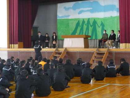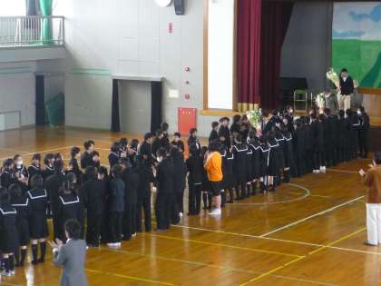 平成24年度修了式 公開日 2013/03/26 更新日 2013/03/26 学校行事 3月25日、平成24年度修了式を行いました。続いて今年度で東部中学校を去られる先生方の離任式を行いました。離任される先生方からお別れの挨拶があり、生徒会より花束が贈られました。 いいね(0)