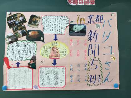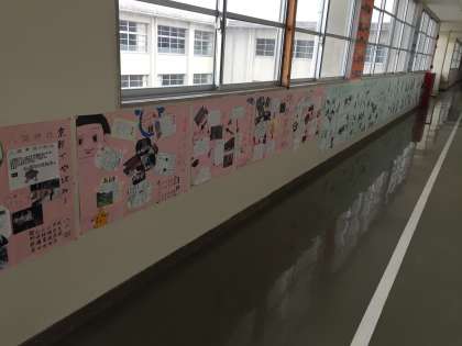 社会見学の班別新聞が完成し、1年生の廊下に掲示しました。それぞれの班で工夫があり素敵な新聞になりました。