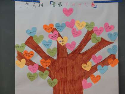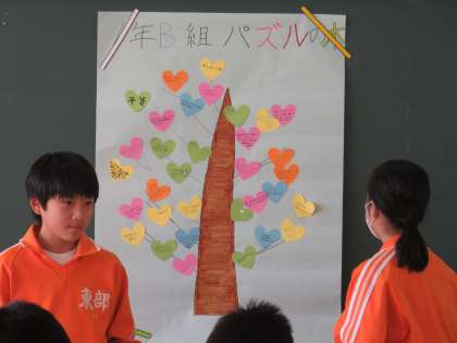 自分たちの人権の木が出来上がりました。A組「勇気をのせた木」B組「パズルの木」です。