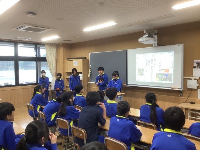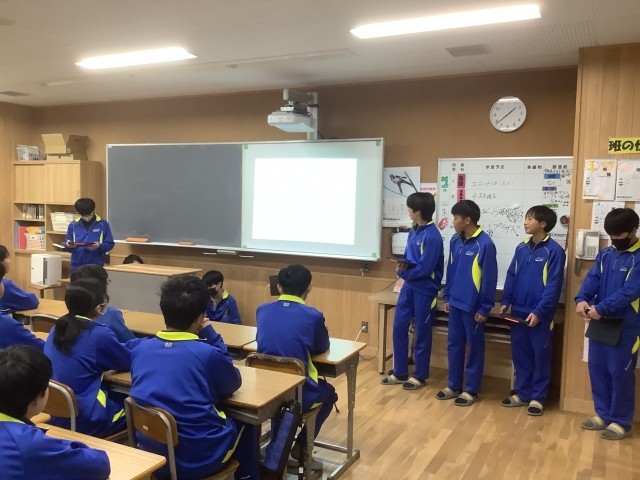 2月25日(水)の5限目に、2年生が、1年生に向けての職場体験発表会を行いました。1年生の各教室で、クイズを交えるなど工夫をしながら行いました。