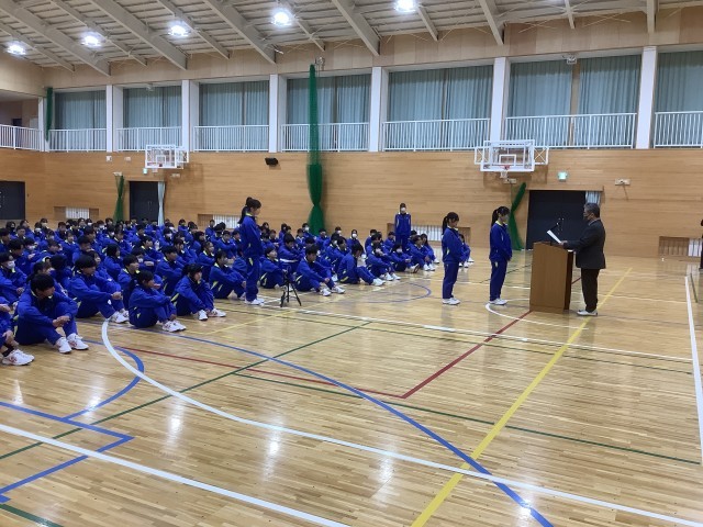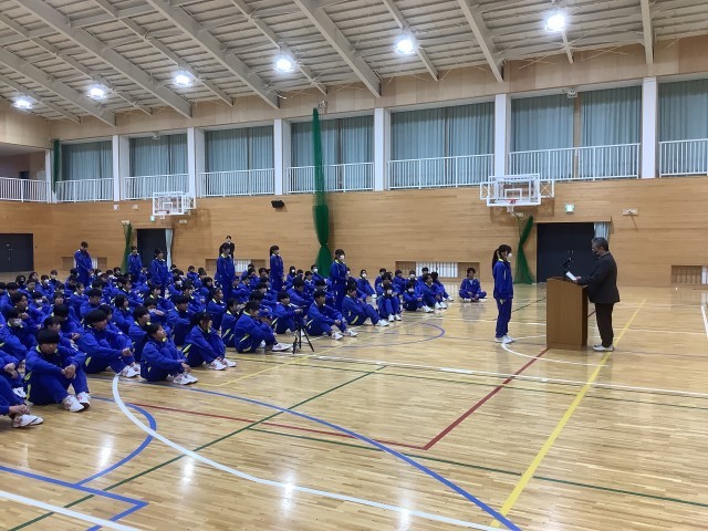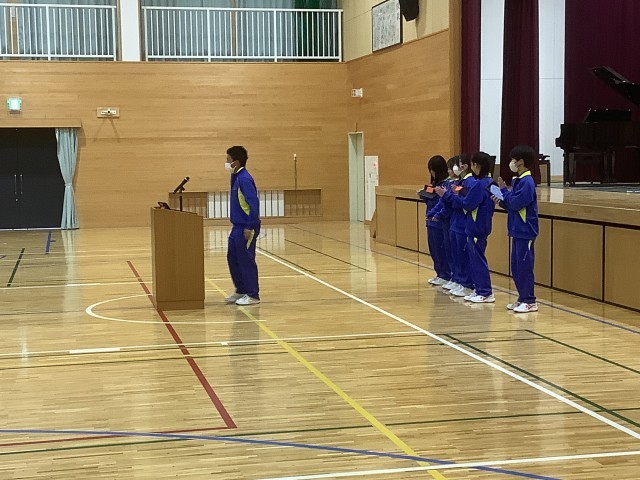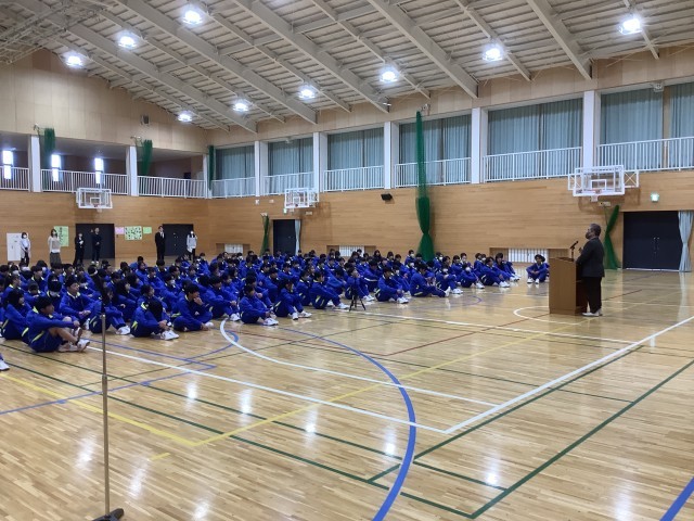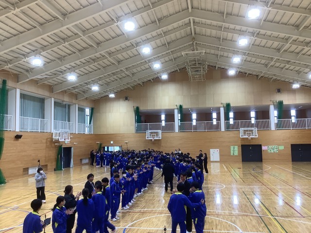3月25日(水)、表彰伝達式・修了式・離任式が行われました。まず、表彰伝達式は、剣道部、英検、バレーボール部の表彰を行いました。3年生が卒業する前に表彰伝達式は行っていましたが、それ以降の分を伝達しました。続いて、修了式が行われ、校長先生からの話、生徒指導担当の先生からの話、後期生徒会役員からの振り返りなどがありました。そして、離任式が行われ、離任される先生や職員、退職される職員から一人ずつ話をしていただきました。最後に、生徒会執行部役員から花束を贈呈し、職員・生徒全員で花道をつくり、感謝の気持ちを込めて見送りました。本当にありがとうございました。