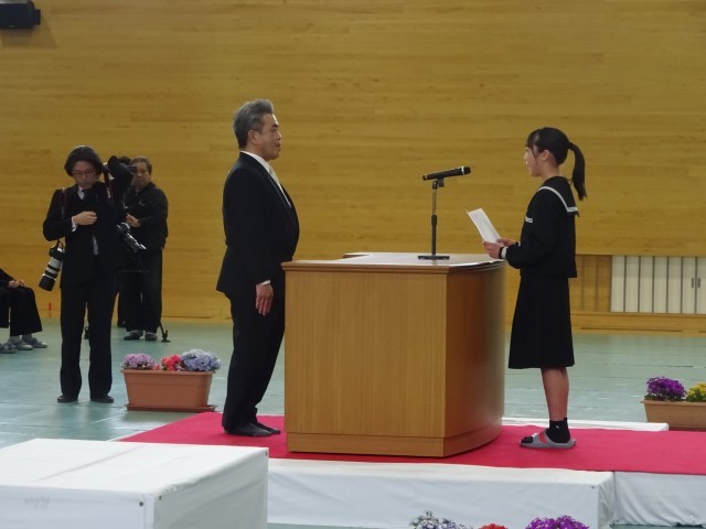 中谷校長からは、学校長式辞の中で「美しい言葉をつかいましょう」「感謝を忘れない」などのお話がありました。生徒代表として3年生の山口恵汰さんが歓迎の言葉を送りました。そして、新入生代表として羽根美空さんが中学校生活の期待を込めたあいさつを述べました。