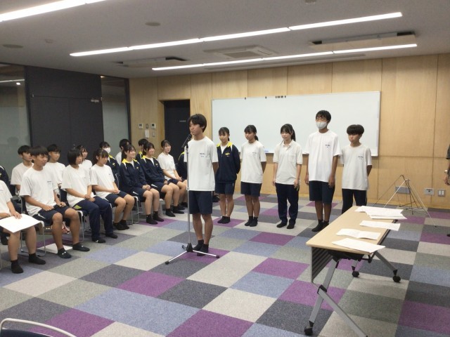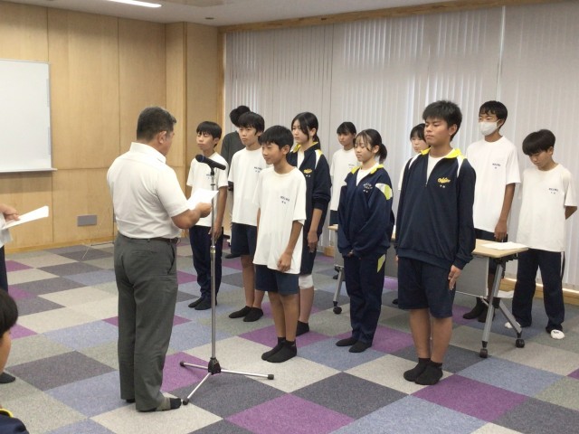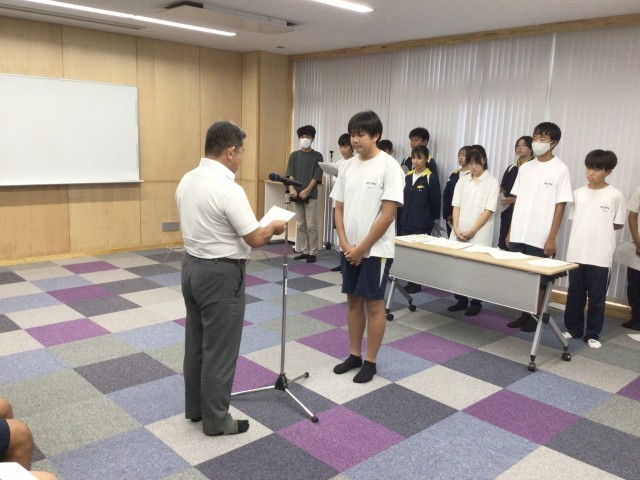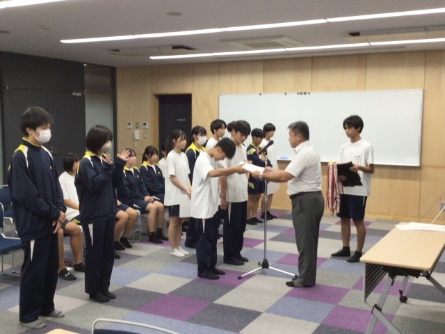 いよいよ1年間の折り返し。本日6限目に表彰伝達、後期の生徒会役員と学級役員の認証式、そして、前期終業式をオンラインで行いました。はじめに、夏休みから新人大会までで活躍したみなさんの表彰伝達が行われました。次に前期生徒会役員の退任のあいさつと後期生徒会役員の認証式、後期学級役員の認証式が行われました。最後に校長先生からのお話でした。前期が終わり、後期が始まる節目の時、前期の振り返りながら、自分たちの目標をしっかり確認し、『節目』を大切にしていこうとお話をいただきました。なお、表彰伝達は以下のとおりです。