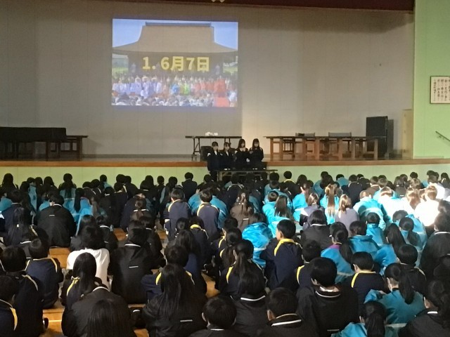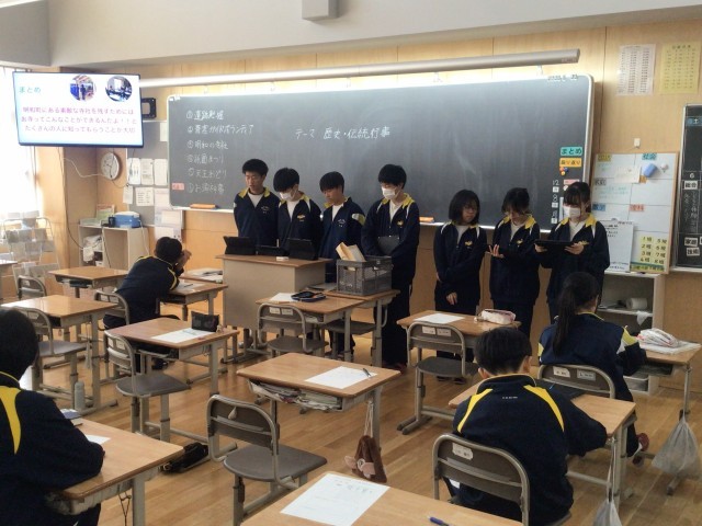 本日、2年生は11月に地域で行った「ふるさと体験学習」の発表会をテーマ別に行いました。お世話になった地域の方もたくさん見に来ていただき、自分たちが体験したことやわかったことを各グループで精一杯発表していました。また、3年生では、これまで取り組んできた地域学習の集大成として、さらによりよい明和町にするためにはという視点で、自分たちがこれまで調査や学習してきたことから、自分たちで考えたいろいろなアイデアを発表してくれました。中学生ながらも地域活性化や自然環境保護など、様々な視点からの提案がされました。最後に級長会から「ふるさと明和町を大切にしていきたい」という言葉もあり、頼もしく感じられました。