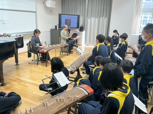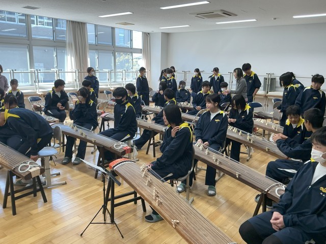 先週より、1年生では筝の演奏に挑戦しています。音楽の授業で、筝や尺八の先生にお越しいただき、筝(こと)の演奏の仕方を教えてもらいました。みんな箏を弾くのははじめてでしたが、興味を持って取り組み、すぐに上達する人もいました。最後に先生の模範演奏も聴かせていただき、日本の伝統文化に親しむよい機会になりました。先生方ありがとうございました。