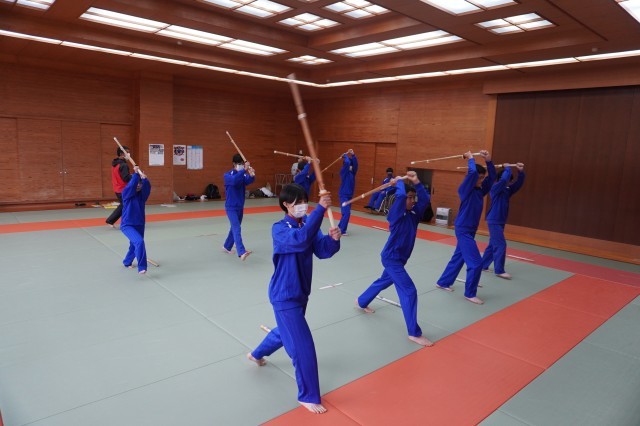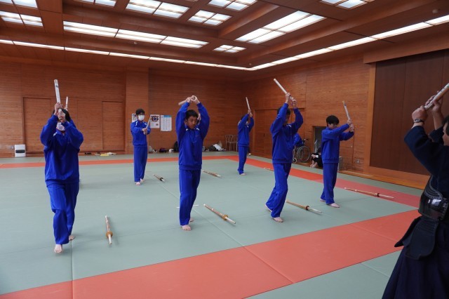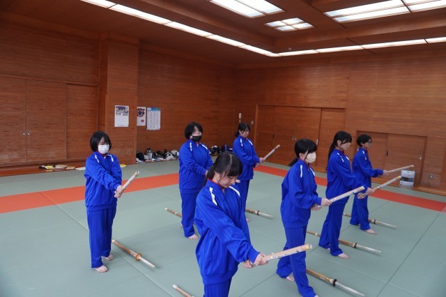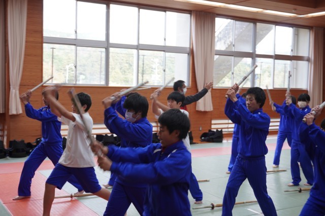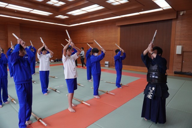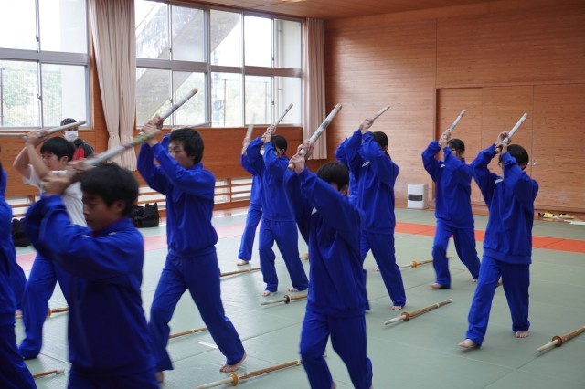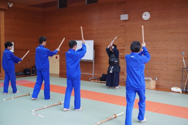 体育で剣道をしています。昨年に引き続き、三重県剣道連盟から派遣された三宅先生に指導していただいています。2年生は昨年に取り組んでいるだけあって、動きを理解し、上手に活動できています。1年生は剣道に初めて取り組みますので、いろいろとまどいながらも少しずつ動きを理解し、楽しみながら活動しています。