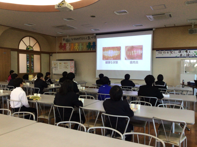 飯高歯科診療所の辻村先生と歯科衛生士の山本さんにお越しいただき、歯と口の健康について授業をしていただきました。