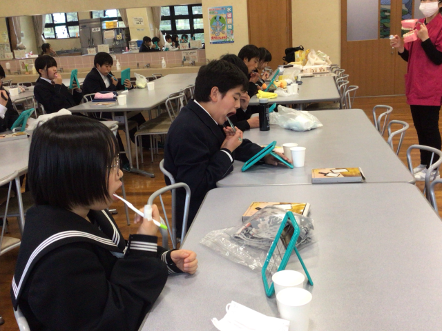 歯の大切さやむし歯を予防する方法、生活習慣が歯に影響することを学びました。また、磨き残しの多いところや第二大臼歯を磨くポイントについて、鏡を見ながら実際に歯ブラシを使って歯磨きの練習を行いました。