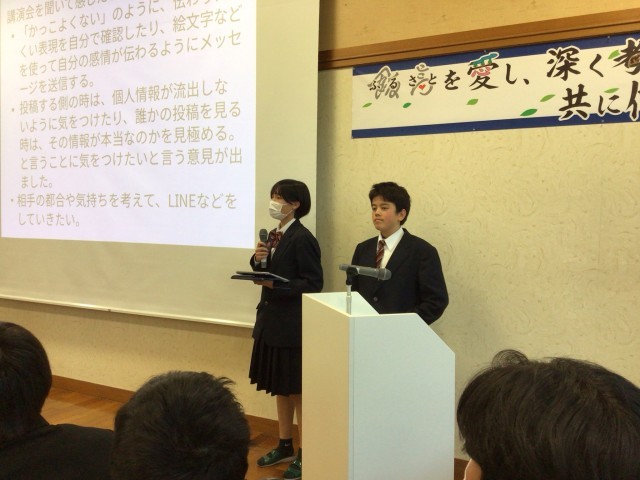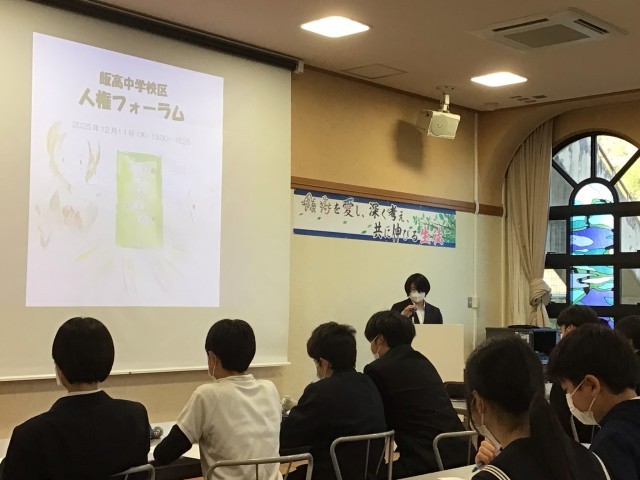 12月11日(木)に飯高中学校区人権フォーラムを開催しました。今年度のテーマは「子どもの人権・SNSについて考えよう」でした。このテーマに関して学んだことを飯高中学校・宮前小学校・香肌小学校の3校が報告し合いました。また、飯高中学校の子ども人権文化フェスタ実行委員会は「障がい者の人権」に関して学んできたことを報告しました。それぞれの活動を報告し合った後は、松阪市教育委員会から来ていただいた中西康樹先生に講演をしていただきました。その後、班で講演の内容について話し合い、「感じたことや考えたこと」「これからの自分は差別に出会ったときやSNSを使うときにどうしていくか」について発表しました。最後の発表では「想像力を大事にして、人を傷つけないようなスマホの使い方をしていく。」「自分は傷つけていないと思っていても傷つけてしまっているかもしれないので、自分の発言に責任を持つ」という意見が出ていました。このフォーラムをきっかけに自分自身の生活や周囲の人との関わり方を見直し、よりよい学校生活につなげてほしいと思います。