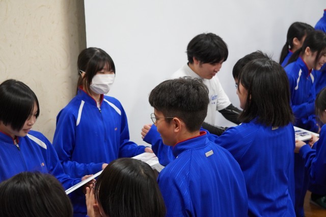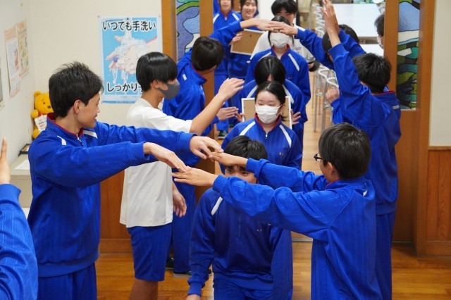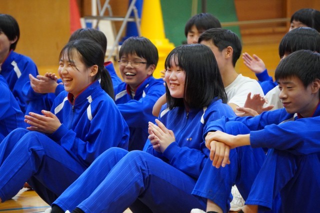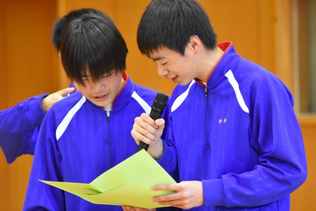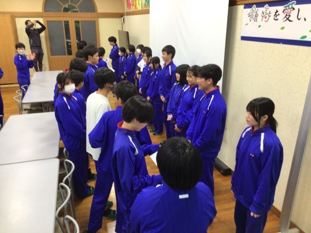 本日、3年生を送る会を開催しました。生徒会が中心となり、3年生に中学最後の楽しい思い出を作ってもらいたいと内容を考えてくれました。ドッジボール大会では全学年混合チームで行い、最後の最後までどちらのチームが勝つか分からない展開となり盛り上がりを見せていました。創作部の発表では仲井さんと小田谷さんにもお越しいただき、「U・S・A」、「恋」の2曲の演奏をしていただきました。ありがとうございました。サプライズで2年生が恋ダンスを披露してくれ、とても楽しい時間となりました。生徒会が作成してくれたフォトシネマはとても素晴らしく、3年生のみなさんに笑顔が溢れていました。そして、3年生のみなさん、1週間後には卒業式ですね。一日一日を大切に仲間と過ごしてくださいね。